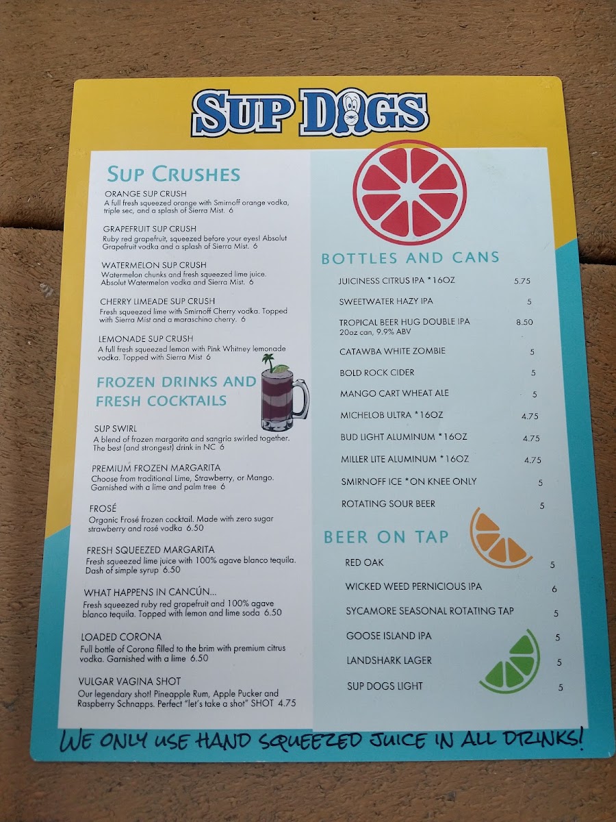 A full orange, squeezed in front of your face! Premium orange vodka, triple sec, and a splash of Sierra Mist. Proudly served in a 17oz. Sup Dogs cup. You keep the cup!